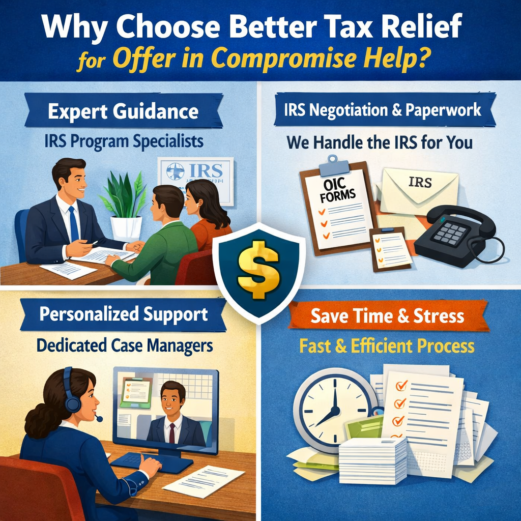 At Better Tax Relief, we specialize in providing professional Offer in Compromise Help, guiding you through eligibility evaluation, financial analysis, and IRS negotiations. Our team ensures every step is handled accurately and compliantly, helping you work toward a true financial fresh start.